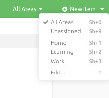 Areas act as global filters separating the major commitments of your work and life, for example Home, Work, Study.