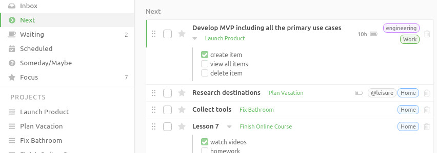 Next combines all of your actionable tasks from active projects, as well as the standalone actions. You can then filter the aggregated list by your context, time and more. This makes it easier to pick the right things to do right now.