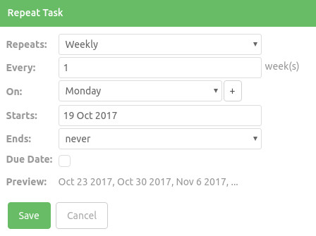 Make Repeating allows you to specify a schedule according to which the acton repeats. A Repeating action will automatically make a focused copy of itself according to the schedule you specify.
